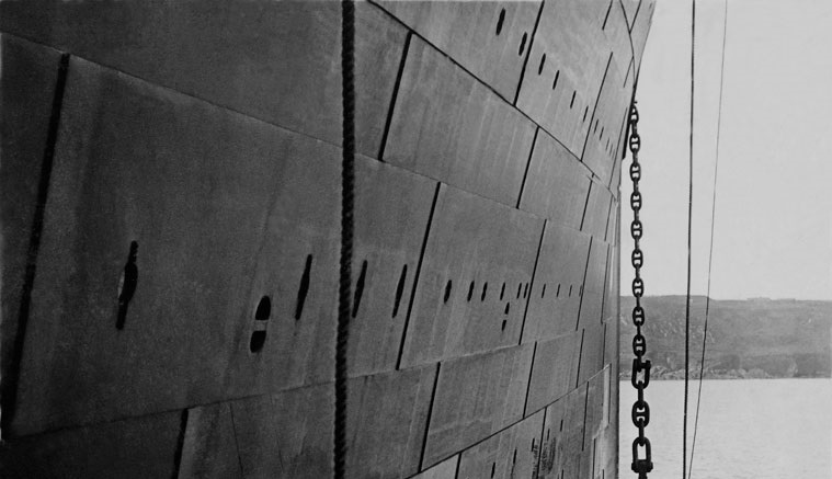 Colpo di elica olimpica. Questa è un’immagine enorme che puoi ingrandire. Ci sono alcuni rivetti vicino al timone. Il resto è mistero.