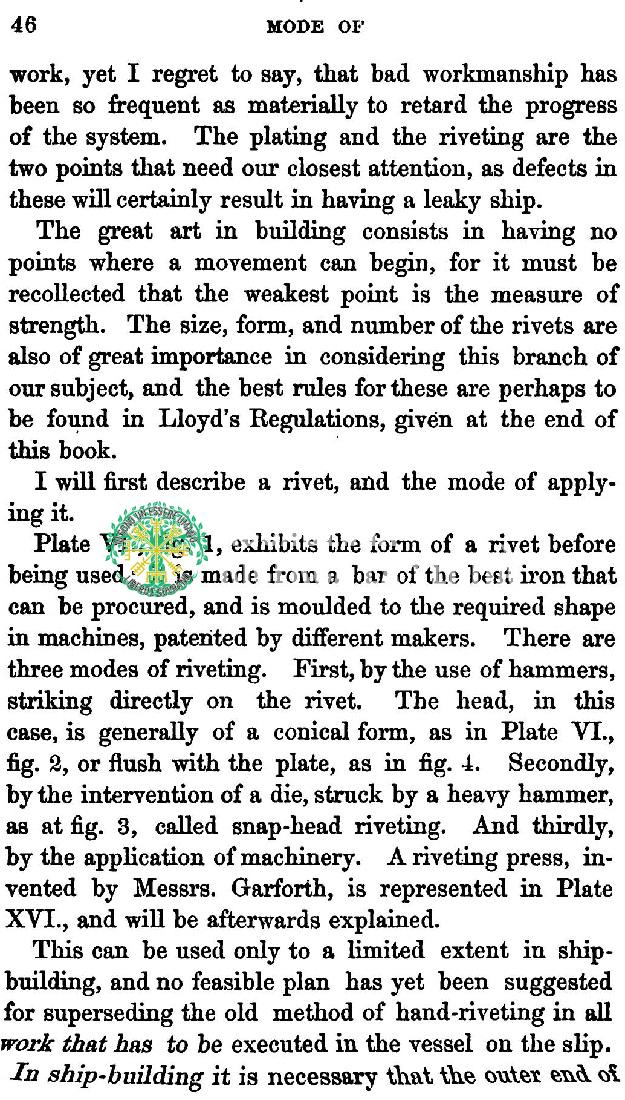 C’è un paio di paragrafi interessanti nel libro del 1868 intitolato “Costruzione di Navi in Ferro, con Illustrazioni Pratiche“. Potrebbe quasi risolvere il mistero se non fosse per la mancanza di prove di un tale rivetto a filo “invisibile”. Se riesci a trovare l’aspetto di questo particolare rivetto, posta un link o carica una foto. Inoltre, se riesci a trovare qualsiasi menzione dei rivetti a filo nella costruzione del Titanic o di qualsiasi altra nave, condividi la tua scoperta. Per ora, gli unici rivetti ufficiali sono quelli mostrati sopra. Di seguito puoi vedere due pagine che coprono questi “rivetti a filo”.