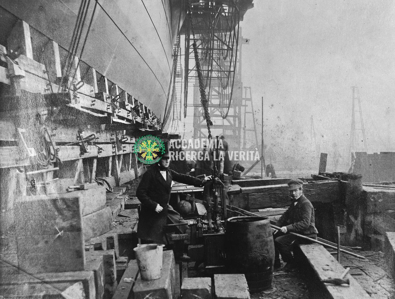 Ipotesi di Korben: a partire dalla metà del 19° secolo e terminando intorno agli anni 1917-1920, Gran Bretagna e Germania (forse anche USA e Francia) acquisirono (attraverso il coinvolgimento militare) un certo numero di navi tartariche di qualità superiore. La Gran Tartaria è stata ovviamente distrutta e cancellata dalla storia. Non essere in grado di utilizzare le navi nel modo in cui erano state progettate (danni indotti dai militari o disadattamento tecnologico – la centrale elettrica del Titanic era in grado di produrre più energia di una centrale elettrica cittadina media dell’epoca), i vincitori (o i sopravvissuti o gli avvoltoi) hanno dovuto ripararle, rinnovarle ed adattarle al loro livello tecnologico (combustibile da carbone, ecc.). A tale scopo furono costruiti bacini di carenaggio. Le navi catturate furono sistemate in quei moli. Le navi originariamente non avevano ciminiere, a causa del diverso carburante “più pulito” utilizzato per alimentare i loro motori a vapore. Sono stati installati fumaiole per sistemare centinaia di tonnellate di cenere emessa dai motori riadattati.