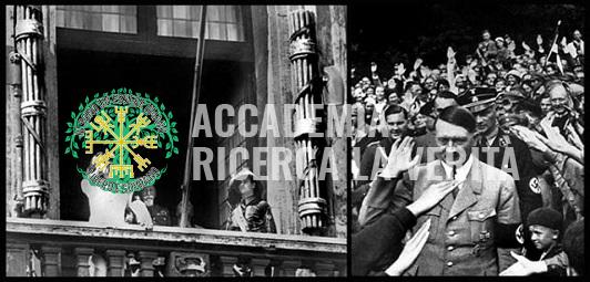 Mussolini con fasci a sinistra e a destra; e Adolf Hitler che fa il suo famoso saluto