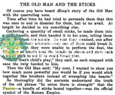 (ndr traduzione dell’ultimo paragrafo: Gli antichi comprendevano così a fondo la verità dell’antica frase “Nell’unione c’è forza” che il Fascio – un fascio di bastoni legati insieme – era il simbolo ufficiale dell’Impero Romano)
